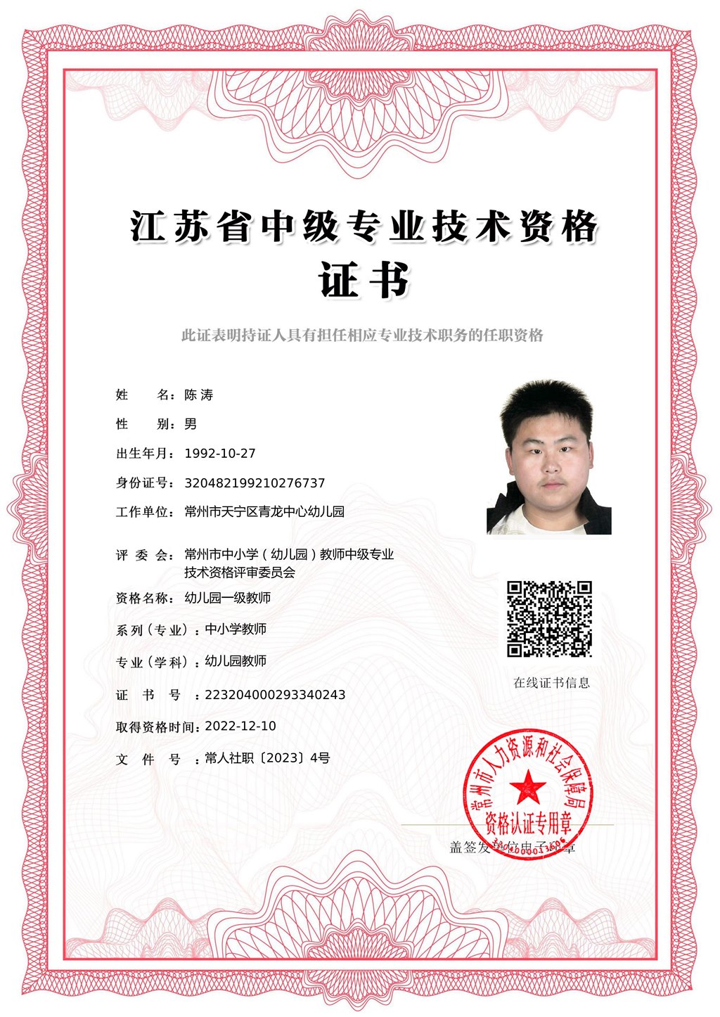 陈涛晋升幼儿园一级教师