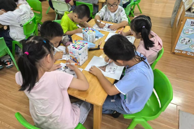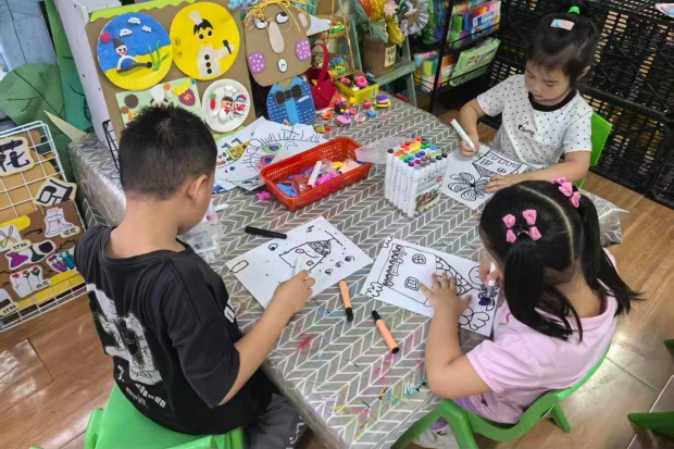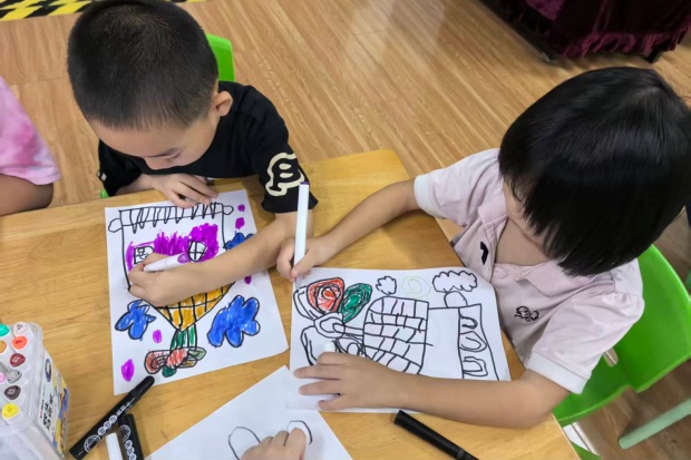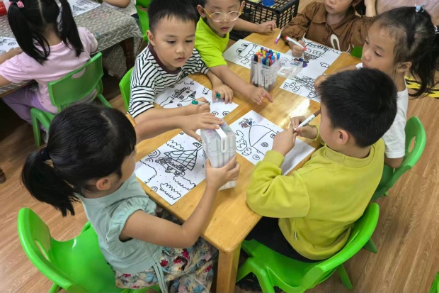 教室里,孩子们围坐在桌前认真涂色:握笔的小手稳稳落下,彩笔在画纸上晕开鲜亮的色块,偶尔有小朋友探头看同伴的作品,桌角的笔盒里各色笔杆摆得满满当当,整个房间都浸着专注又软乎乎的热闹。