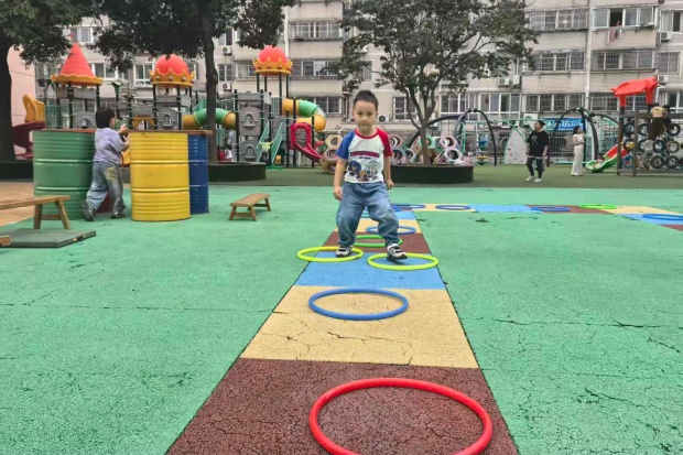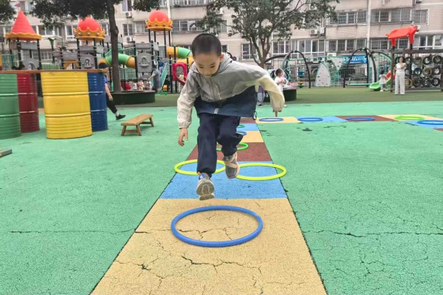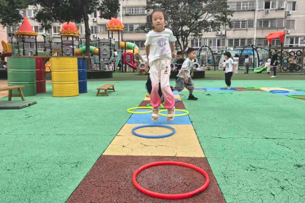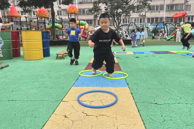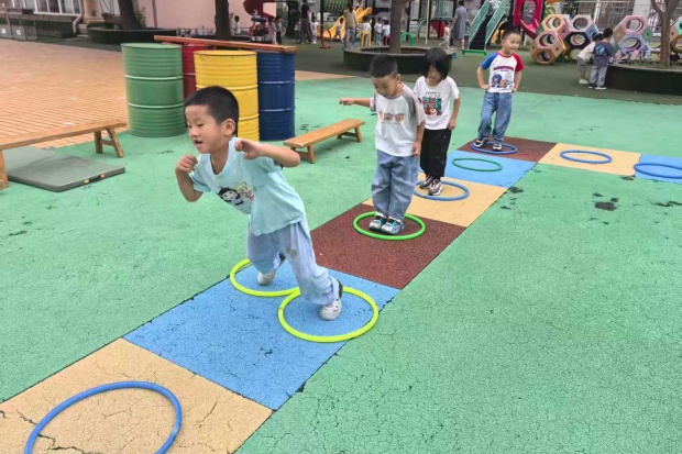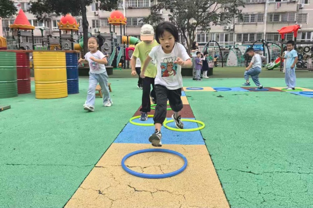 彩色地垫上,圈圈排成了活泼的“跳格子”赛道:女孩踮着脚轻跃,裙摆跟着扬起弧度;男孩们迈着小步蹦跳,有的张开手臂找平衡,有的干脆撒开腿往前冲。笑声裹在风里,连阳光都跟着暖起来——小家伙们脚踩彩圈,把跳跃的动作揉成了软乎乎的热闹,每一下蹦跶都溅起满场的孩子气,仿佛一个个可爱的小兔在跳跳……